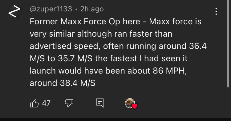 Having ridden Stealth this summer, bias aside, I seriously think Maxx has the faster acceleration. That checks out if the Intamin accelerators generally don't hit their advertised speed, especially if Maxx is going over its advertised speed.