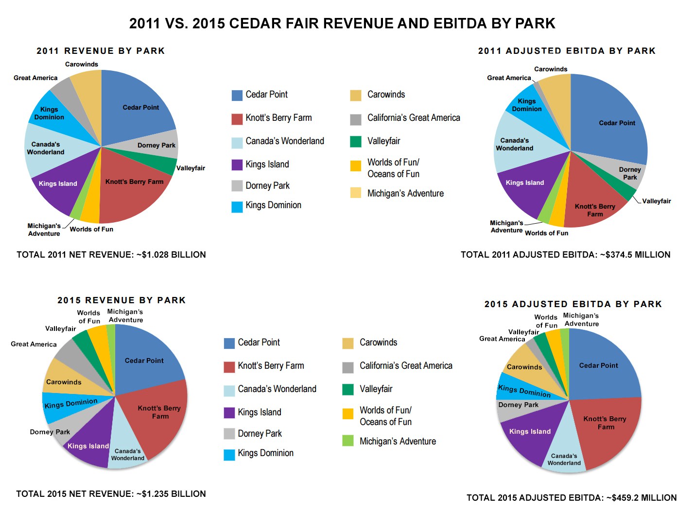 I actually found those charts you were talking about in regards to Cedar Fair! This is very revealing and I wish Six Flags would release a chart like this to the public, so we could see exactly which parks are the most profitable and produce the most revenue!