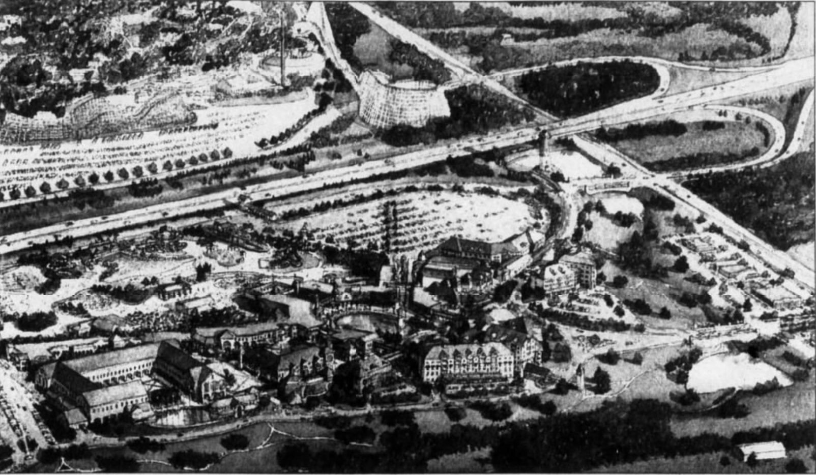 This is not technically a former ride, but a former plan. I dug up this old artist drawing of what Hurricane Harbor and its hotel would've looked like if built across the tollway. Very interesting!