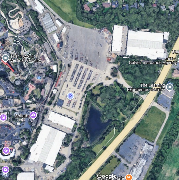 As far as the giga goes. There is definitely room. They could build a new storage building in the wooded area as seen in the picture and demo the old building and that would open up a plot of land almost the size of Hurricane Harbor and the neighbors would be far enough away that no legal challenge would stand. They could build the worlds first giga twister like they did with the first hyper twister