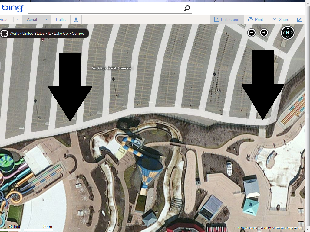 Looking on Google Maps you can see 2 paths in Hurricane Harbor, one in riptide bay and one over by the big wave pool which lead right into the parking lot. Now, my question is, If Six Flags Great America decides to expand Hurricane Harbor yet again and eat up more of the parking lot, can they drain the pond next to Superman and build a separate parking lot for the busses over there to make more room? I have no idea if that pond is even on Six Flags Property. Image