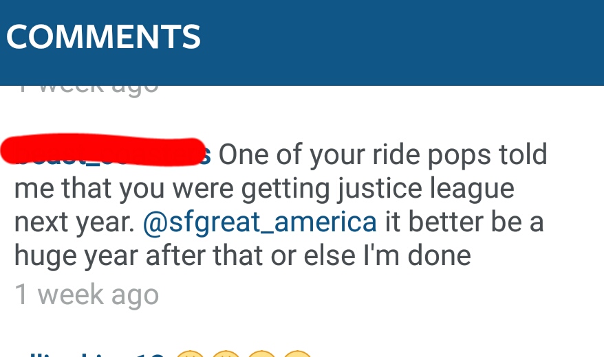 Today at SFGAm: In line for Whirligig: Teenage Girl - What's this ride even called, the swings? In line for Batman: The Ride: Grown Man - (Group talking about what would happen if someone went in the restricted area under the coaster) Well, the Batman goes 90 MPH, so...