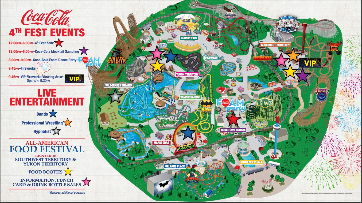 July 4: Mardi Gras Hangover, THE JOKER Free Fly Coaster, Goliath, SUPERMAN: Ultimate Flight, Raging Bull, BATMAN The Ride, Revolution, Hometown Fun Machine & Chubasco
