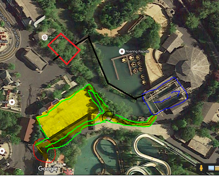 -Blue: New queue line/plaza for Batman: The Ride(removal of SF Outfitters required)