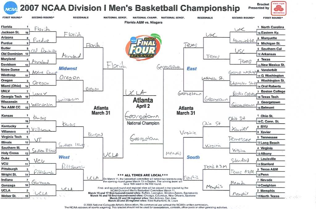It was tough, id like to say SIU is going far but too many powerhouses. Im not really confident in my left side of the bracket cause I dont really know the teams that well, but I like the Hoyas as the national champions and the Georgetown Texas game might be the game of the year.