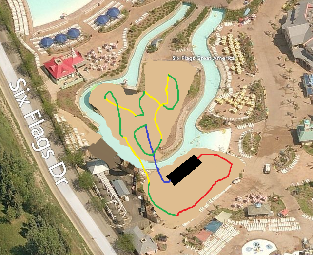 This shows Deluge @ Kentucky Kingdom in the space currently used by the sand area and a path that isn't really used. Both ends are elevated, so guests can still access the lazy river without needing any pathwork(the support beam is in a little grassy area), and that building on the other side can still be used.