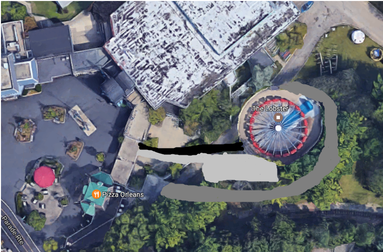 I couldn't find a satellite picture of a Zamperla Endeavour, so I'm using Orbit for reference. It takes up all of BB's excess queue,yes, but a new queue block can be built where the shruberry is, and the exit can be BB's line goes into the excess queue. What they would do to separate the entrances to these two attractions, I don't know. But I've proved my point, so