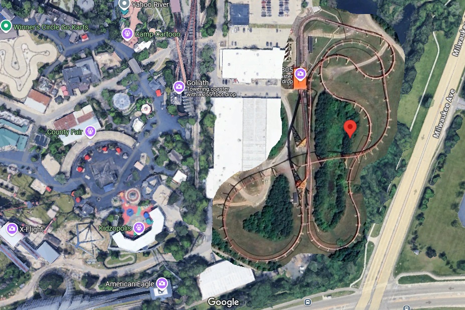 As far as the giga goes. There is definitely room. They could build a new storage building in the wooded area as seen in the picture and demo the old building and that would open up a plot of land almost the size of Hurricane Harbor and the neighbors would be far enough away that no legal challenge would stand. They could build the worlds first giga twister like they did with the first hyper twister :lol: