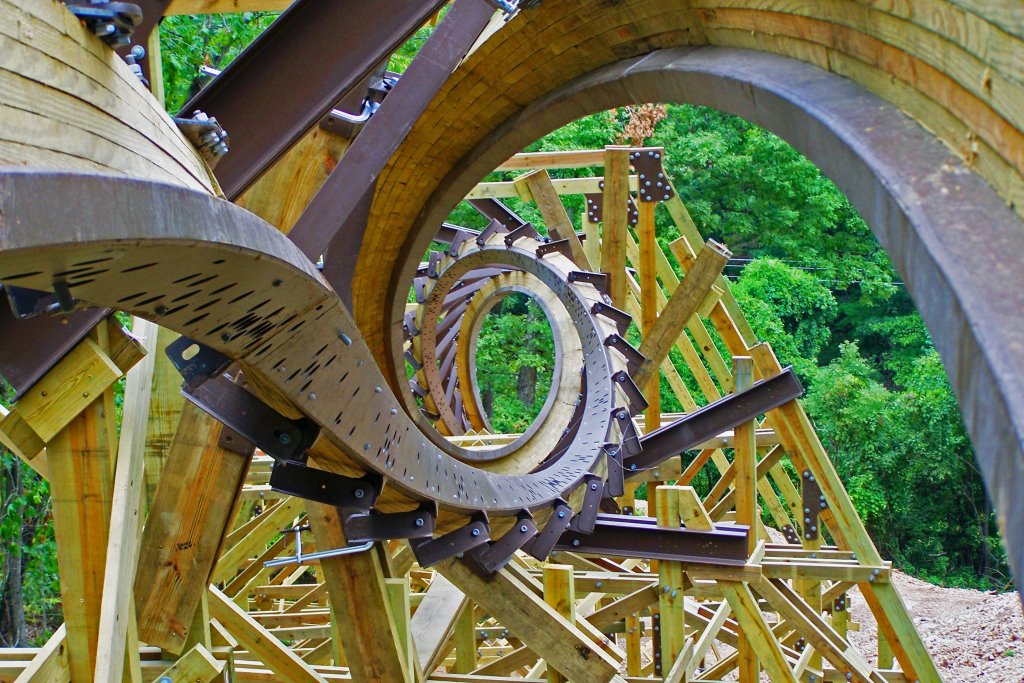 In my opinion, the tell-tale sign that we should consider Outlaw Run (and Goliath) steel coasters is that they do not feature a walkway around the whole course. This is because Topper Track naturally maintains its shape like a steel coaster and does not require daily maintenance to bend the track into shape. This is the reason that Topper Track was created: it can be seamlessly installed into existing wooden coasters to make them smoother and lower maintenance. We get into a real grey area here, I'm not sure how to classify a coaster with some wood sections and some steel sections. In my opinion, we should consider these partially steel and partially wood.