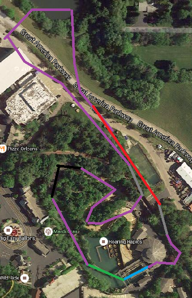 Blue: Station, Purple: Track, Red: Lift Hill, Gray: Brake Run, Black: Tunnel, Green: Hold/Brake Run