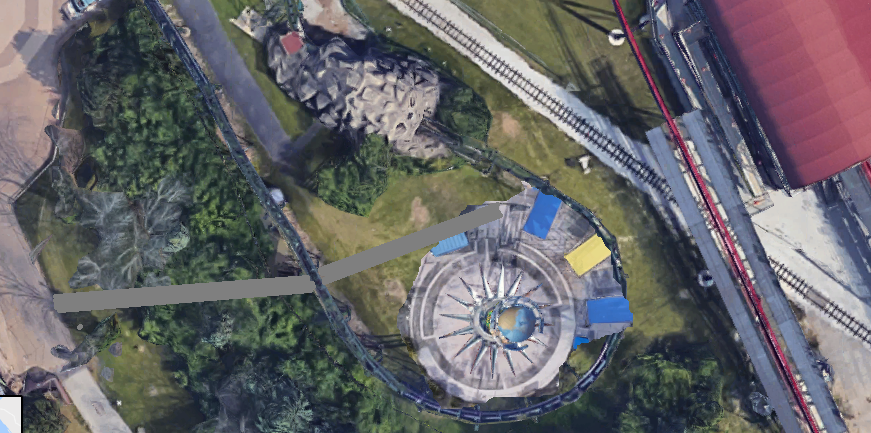 I couldn't find a satellite picture of a Zamperla Endeavour, so I'm using Orbit for reference. It takes up all of BB's excess queue,yes, but a new queue block can be built where the shruberry is, and the exit can be BB's line goes into the excess queue. What they would do to separate the entrances to these two attractions, I don't know. But I've proved my point, so