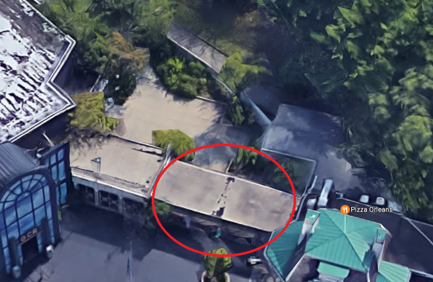 3D view, Circled in red is where the endeavour's entrance and exit would be (Right next to each other to maximize space), building on the left would have to be opened up from the side for the TDK's flash pass queue.